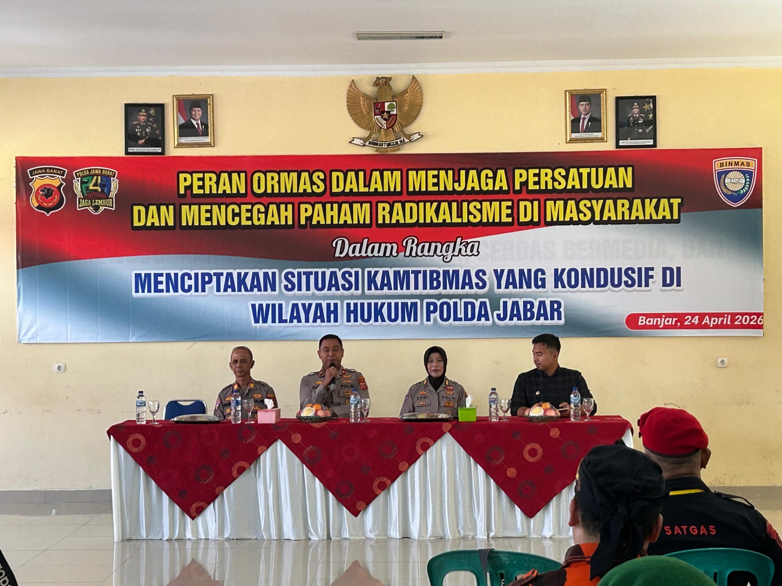 BANJAR — Upaya memperkuat peran organisasi kemasyarakatan (ormas) dalam menjaga persatuan bangsa dan menangkal paham radikalisme kembali ditegaskan melalui kegiatan Sosialisasi dan Pembinaan Ormas yang digelar Dit Binmas Polda Jawa Barat di Aula Presisi Polres Banjar, Jumat (24/4/2026) siang.