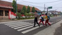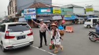 Polsek Banjar Tempatkan Personil Bantu Penyebrangan Anak Sekolah Di Jam rawan pagi hari antisipasi kecelakaan lalulintas di jalan raya
